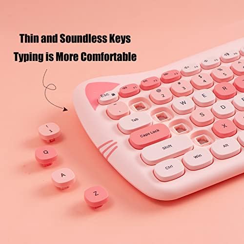 Cute Cat Keyboard and Mouse Combo Wireless, Kawaii Keyboard and Mouse for Girls and Kids, Soundless Colorful Keys, Compatible with Notebook, PC (Pink-84Keys)