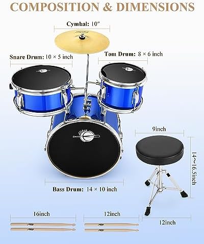 Set contains content -14″ x 10″ Bass drum x 1,8″ x 6″ Mounted tom x 1,10″ x 5″ Mounted snare x 1,10″ Cymbal with cymbal arm x 1, Plating bass drum pedal x 1. Round padded adjustable drum throne x 1 ,Kids wooden drum sticks x 2,7A wooden drum sticks x 2.Easy to read set up instructions (Assembly is required) x 1,12-Month Product Warranty.