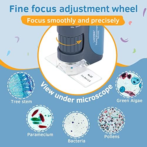 LAKWAR Pocket Microscope for Kids, 60x-120x Zoom Led and UV Lighted Pocket Microscope, Mini Handheld Microscope for Kids Adults, with 5pcs Prepared Microscope Slides