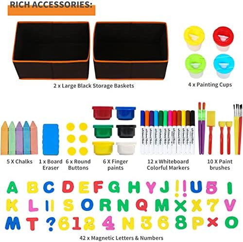 [Rich Accessories] Wooden art kids easel comes with plenty art supplies including 12 vivid color whiteboard Pens, 1 eraser,1 set of letters & numbers, 1 paper roll(18”*787”), 6 round button(Used to fix the paper roll), 4 plastic brush washer cups, 2 storage baskets. Everything you need , all in one set.