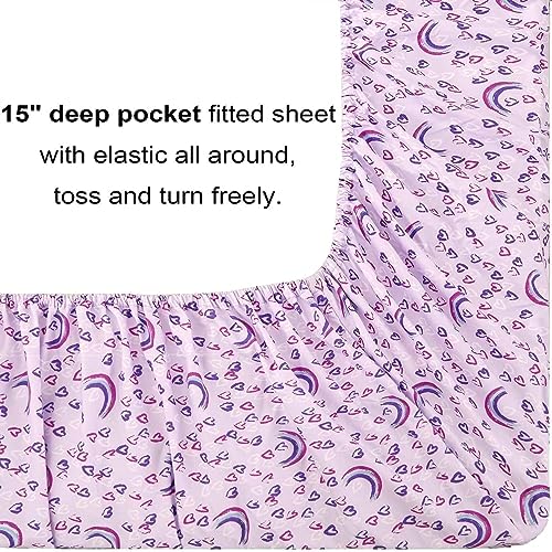 8 Pcs Girls Full Bedding Set: Purple full size bed in a bag with love and rainbows pattern includes 1 comforter (76″x86″), 1 flat sheet (81″x96″+4″), 1 fitted sheet (54″x75″+15″), 2 envelop pillowcases (20″x30″), 2 pillow shams (20″x26″+2″) and 1 decorative toy pillow.The purple love rainbow bed set for girls keeps it fits the body effectively.
