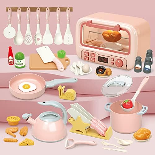 Yalujumb Microwave Kitchen Playset,Kids Pretend Play Electronic Oven with Play Food,Kids Cookware Pot and Pan Toy Set, Cooking Utensils,Learning Gift for Child (Pink)